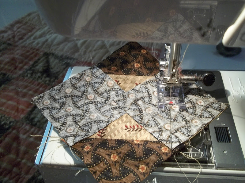 Sew on the line or a hair to the right of that line, right sides together in one corner. You can chain stitch if you have more than one block to do.Flip your block around and sew on the opposite corner square. If you notice I use a sewing foot which has a little red arrow on it, this keeps me right on track following my diagonal line.